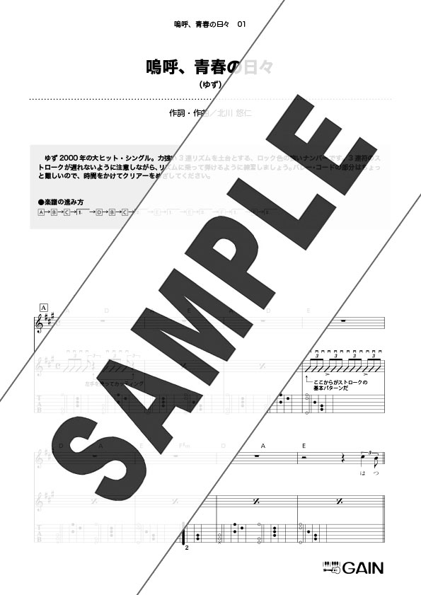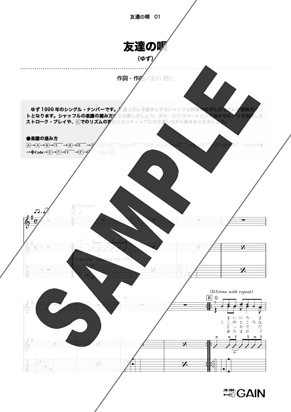 | ゆず2000年の大ヒット・シングル。力強い3連リズムを土台とする、ロック色の強いナンバーです。バレー・コードにも挑戦しましょう。 | ||