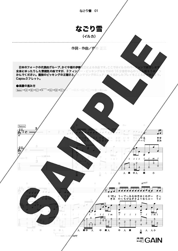 | かぐや姫の伊勢正三の作品ですが、これはイルカのバージョンです。スリー・フィンガー・ピッキングを基本とするプレイにチャレンジしましょう。Capo=3f | ||