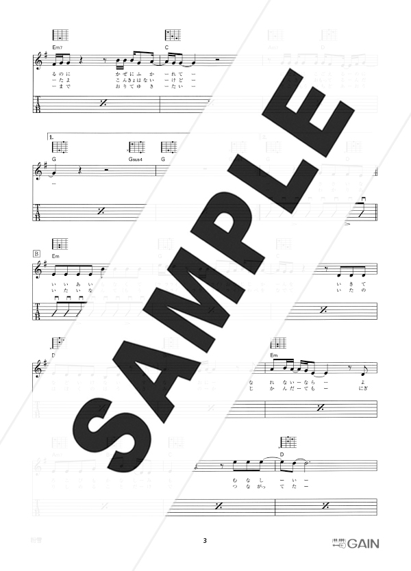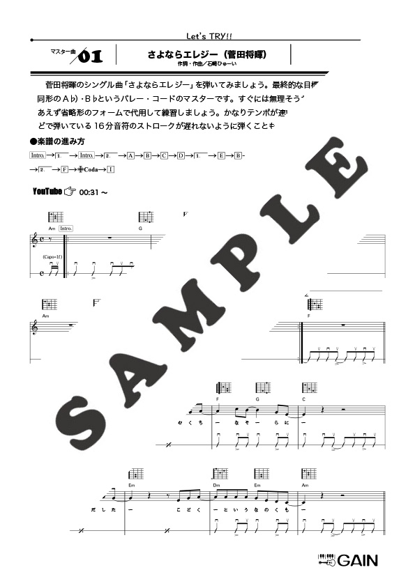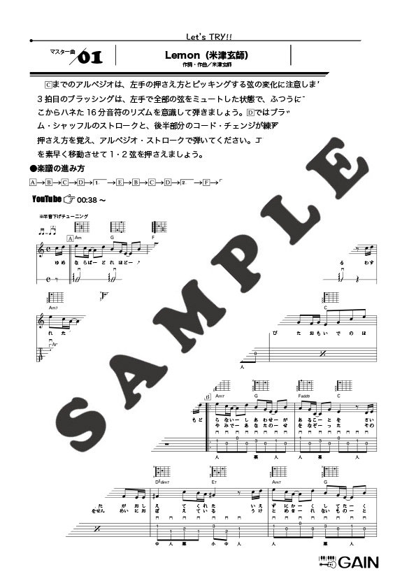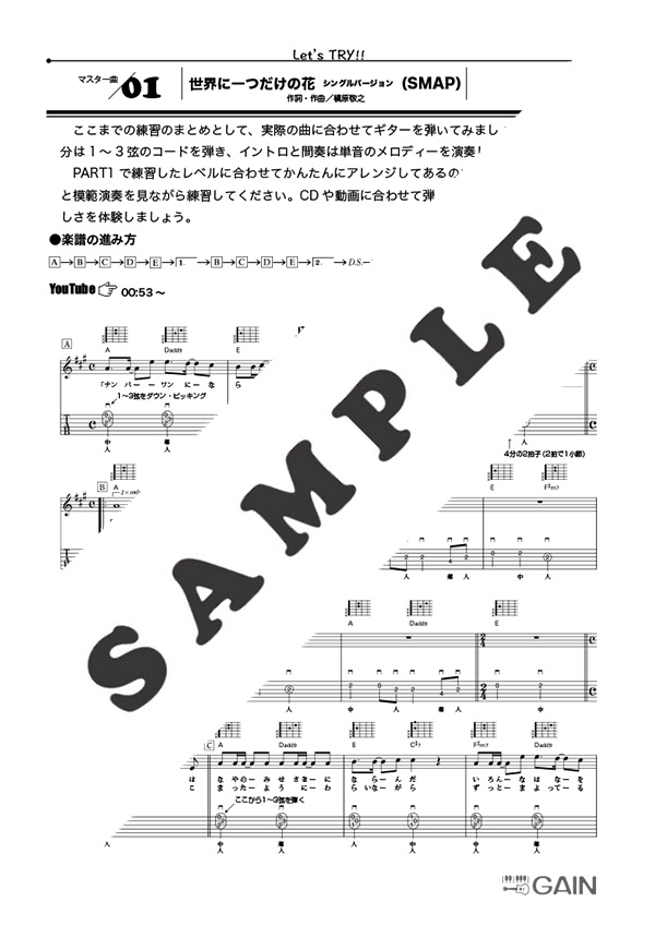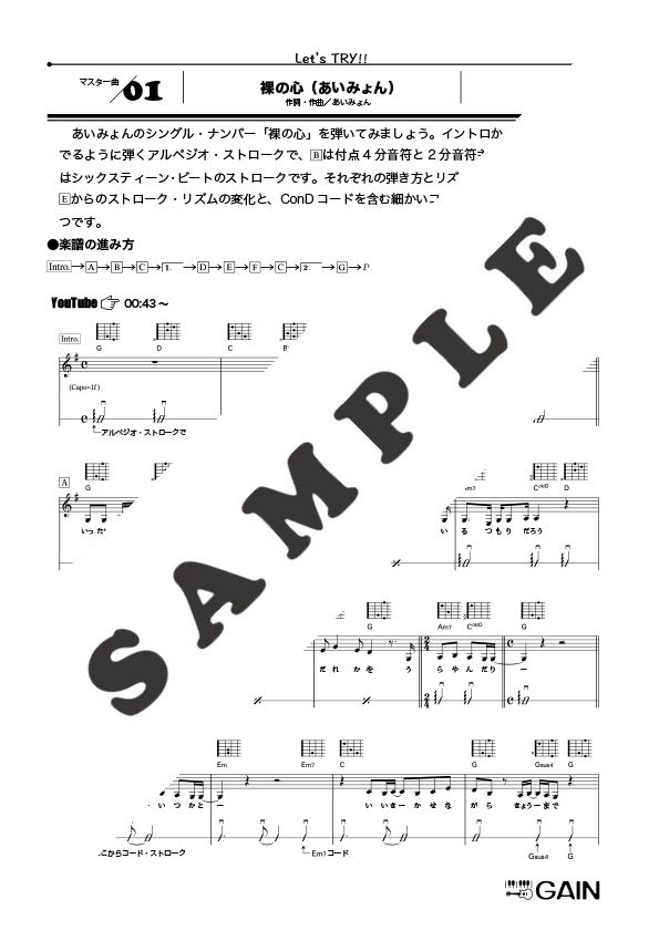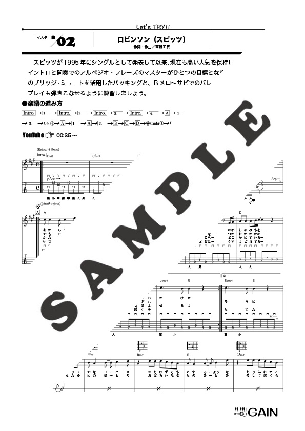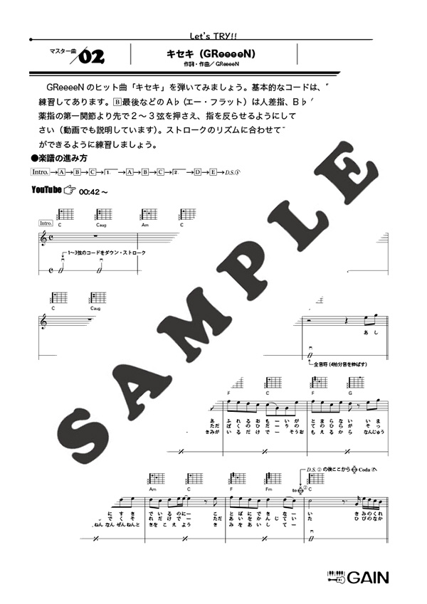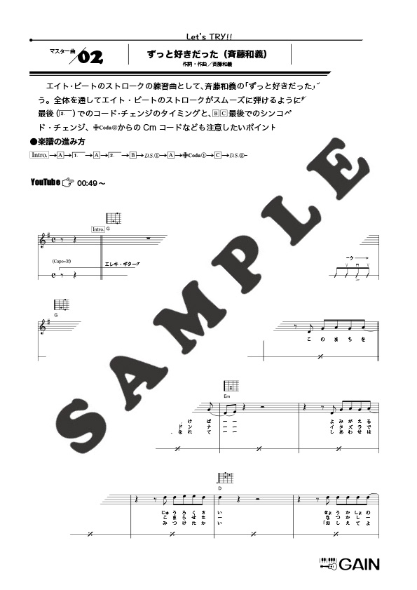 | ギター1本のコードストローク・バッキングで弾き語りが超盛り上がる曲。イントロのディレイを使ったリードプレイの解説もついている。演奏+解説動画はYouTubeにて公開中です | ||