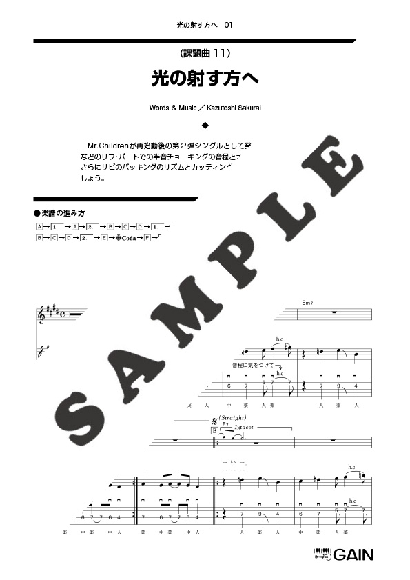 | バッキングのオクターブ奏法のギターを中心にコピーしました。ミスチルのコピーバンドなら最初にトライするべき1曲。模範演奏+ギターカラオケ付き | ||