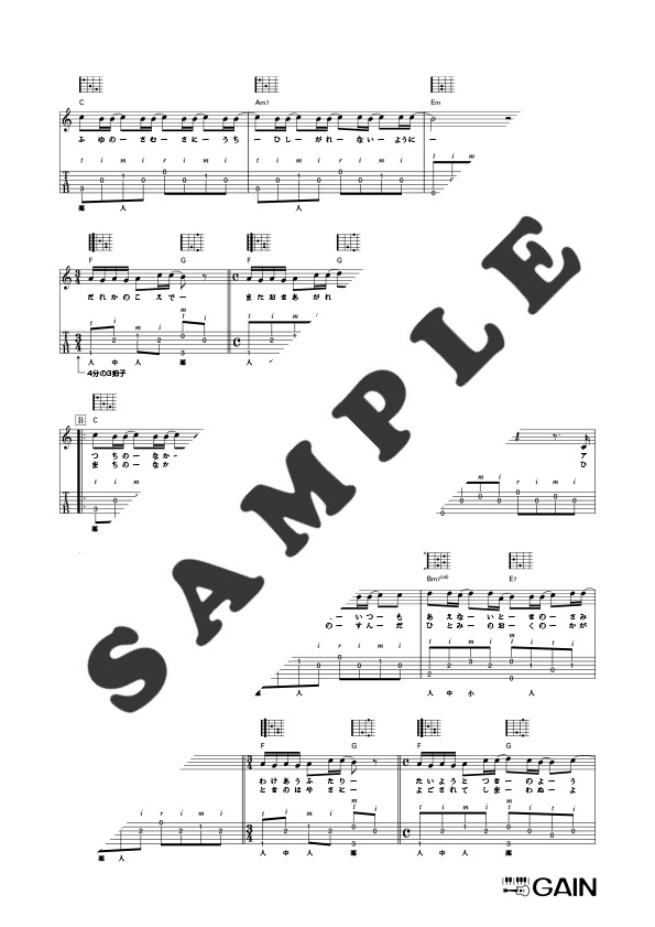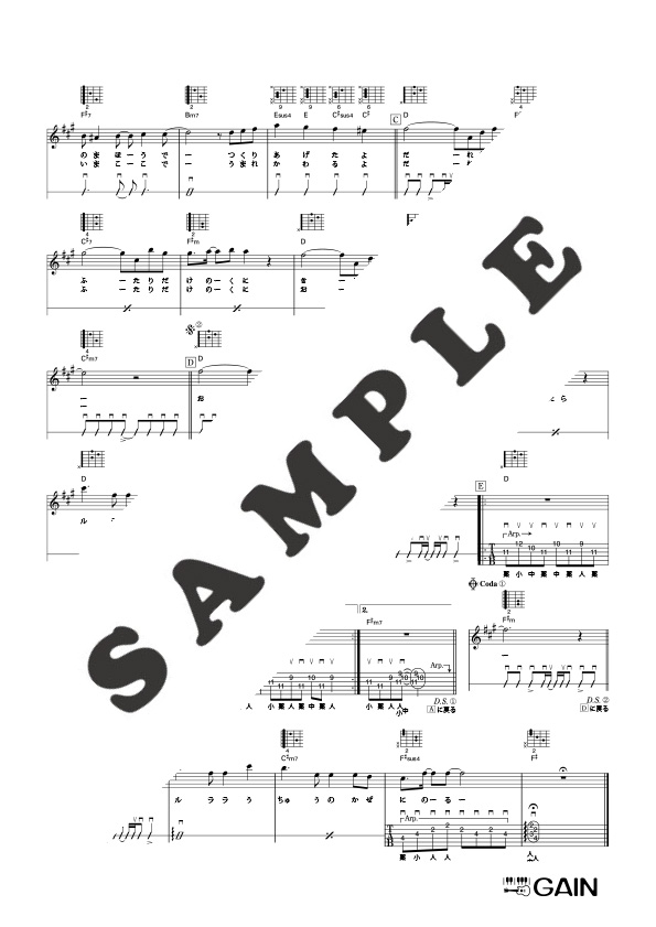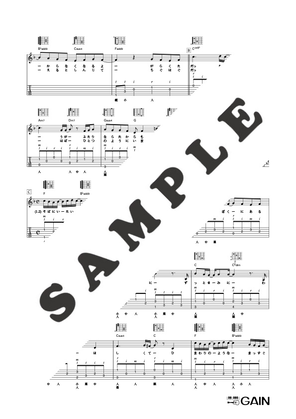 | 指弾きアルペジオで曲を伴奏してください。ボーカルを加えればコブクロのなった気分が味わえるはずです。途中の変拍子や転調が練習ポイント。演奏+解説動画はYouTubeにて公開中です | ||