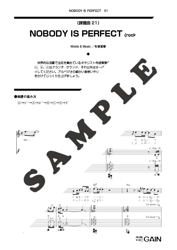 | アルペジオからシングルノートでのバッキングフレーズを中心に収載しました。間奏のギターソロがこの曲最大のポイント。模範演奏+ギターカラオケ付き | ||